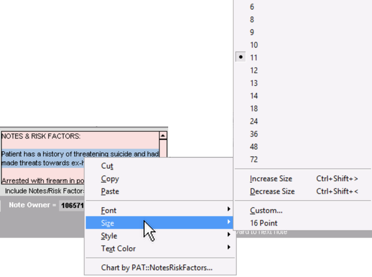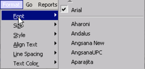 While typing anywhere in the program, look to the top-left of your screen for the Format drop-down menu. Clicking there, you can adjust the Font (Arial, Courier New, Tahoma, Times New Roman), Size (6 pt, 10 pt, 12 pt, etc), or Style (Bold, Italic, etc) in whatever field you are working in. Much like Microsoft Word, you can highlight sections of text, then use the Format menu to make edits to the text.