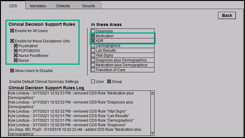 2. Under the CDS tab, select "Medication" and "ADR", select prescriber types and don't forget to select nurses if your nurses enter verbal medication orders.