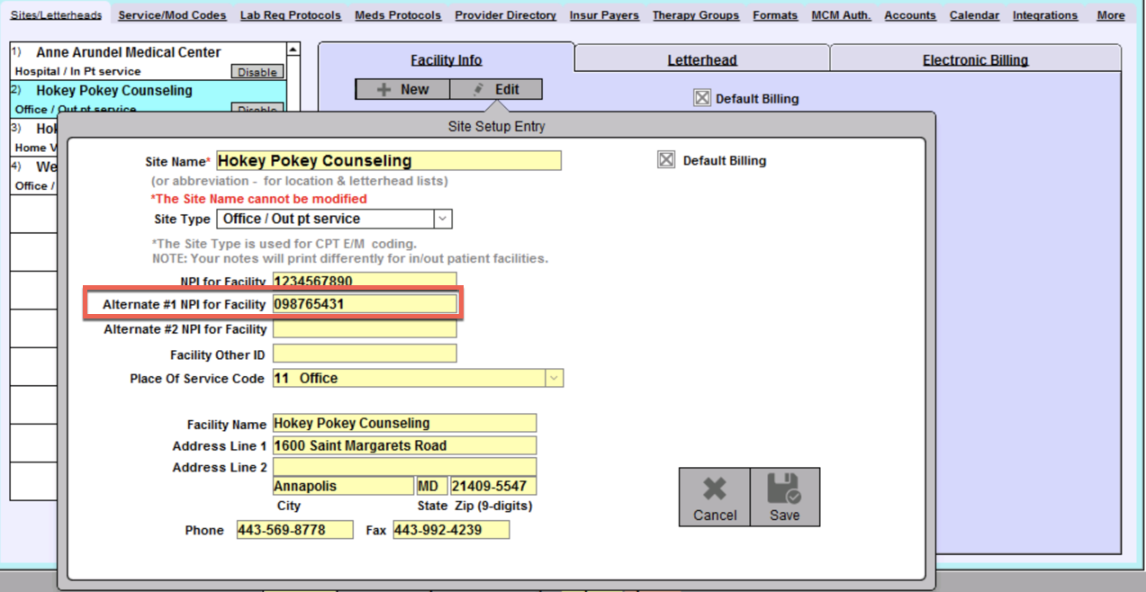 - Click the 'Use Alternate Facility NPI on Claims.'