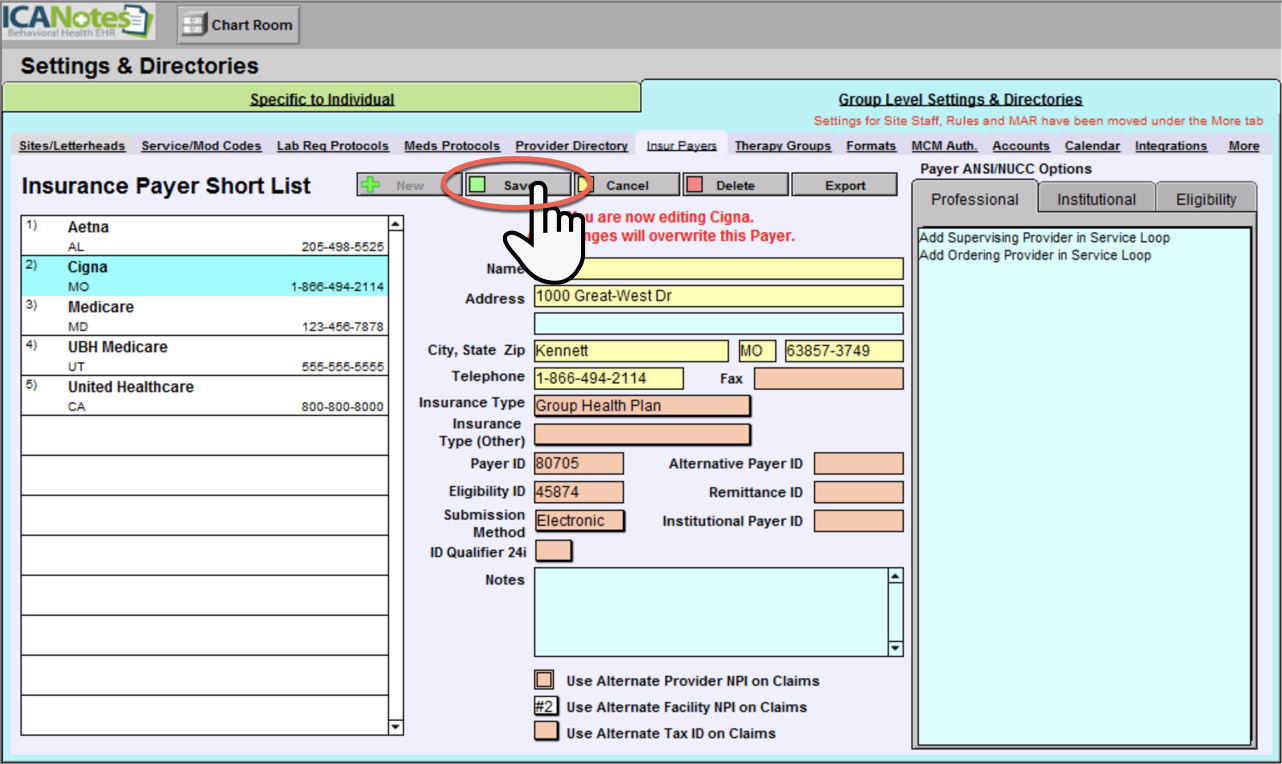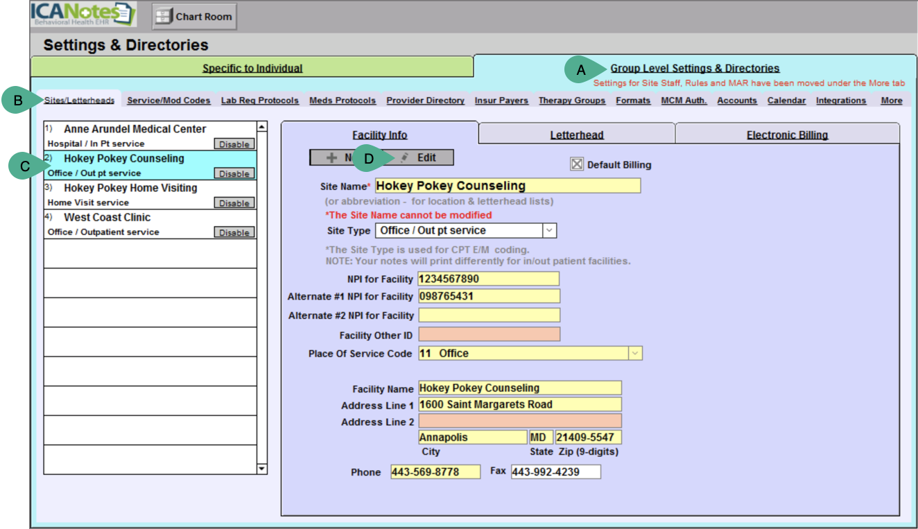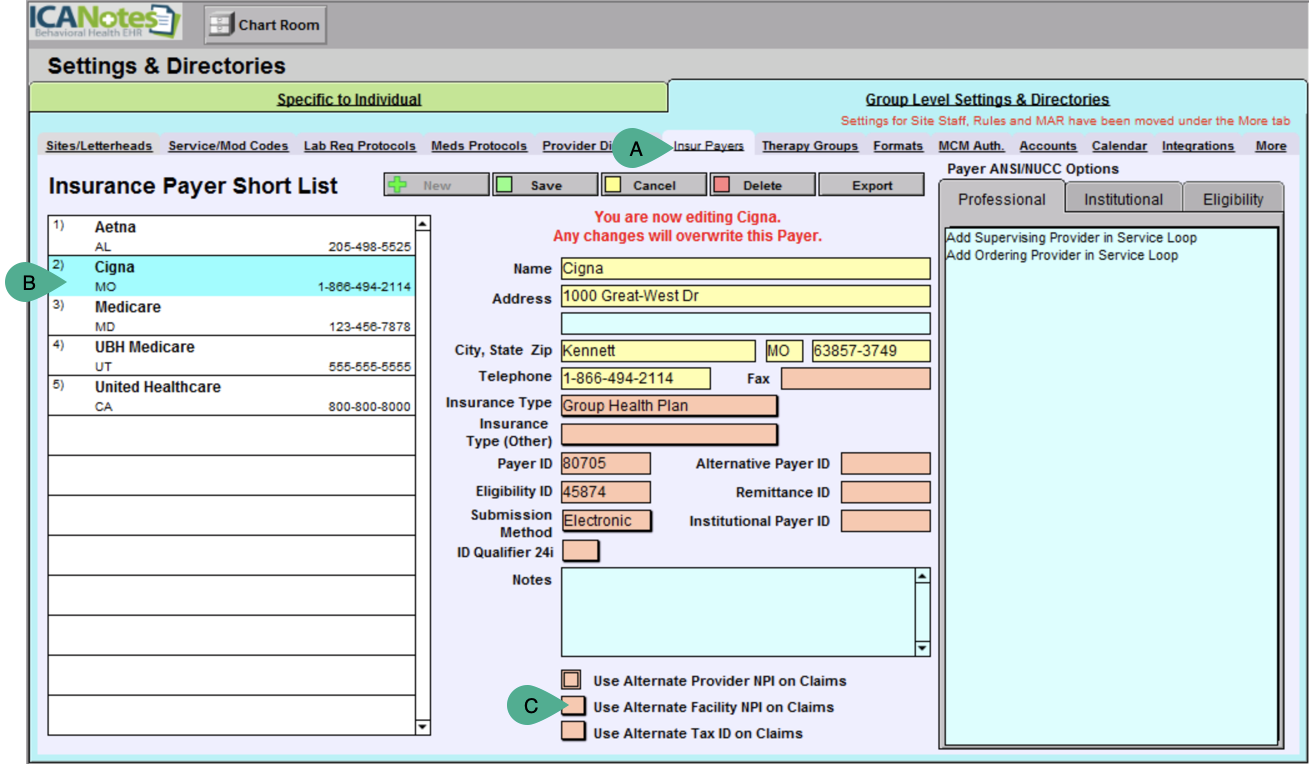 As a Group Administrator, you can add the alternate facility NPI under the Sites/Letterheads tab and activate for the insurance payer under Insur Payers tab.