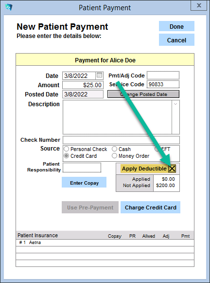 3. From the patient payment window, check the "Apply Deductible" box. You must also enter the payment amount and source. Click the