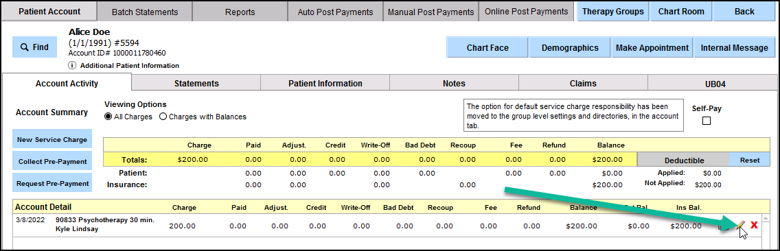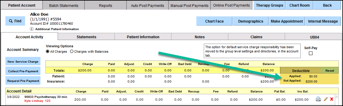4. The deductible information then shows in Patient Accounts as shown below. The full deductible initially shows under "Not Applied".