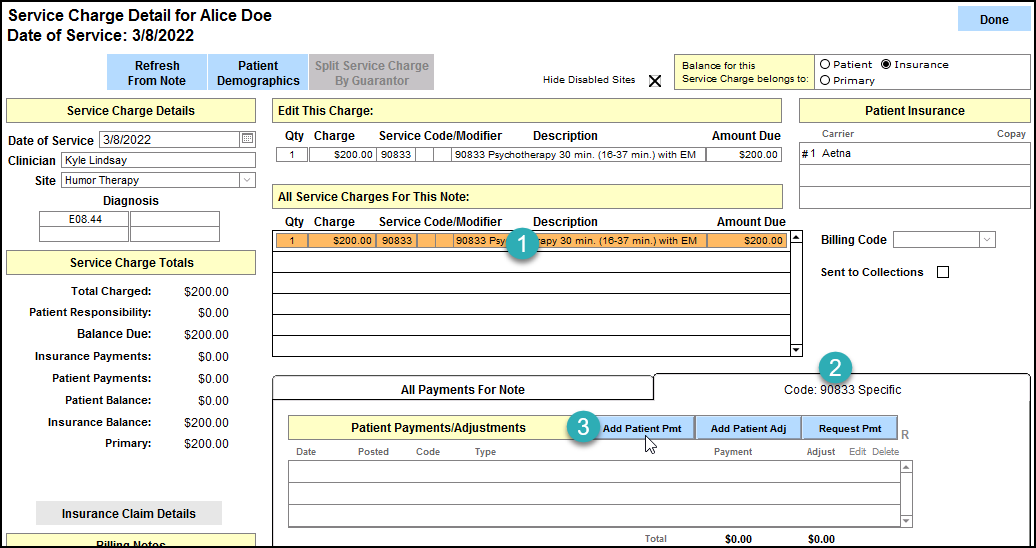2. From the Edit Service window, select the service charge in the middle (1), select the Code Specific tab (2), and then click the