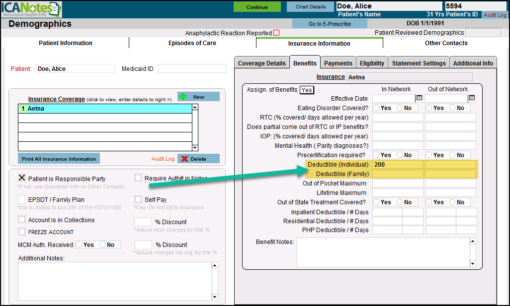 3. You can enter deductible amounts here. Please note that only the Deductible (Individual) In Network field communicates with Patient Accounts.