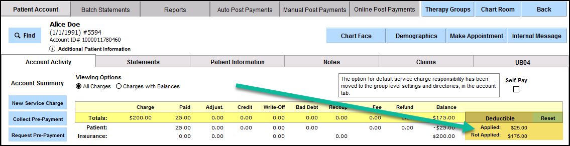 4. The Patient Account deductible information is updated to reflect the "Applied" and "Not Applied" amounts appropriately. The "Not Applied" is decremented by the payment amount and the "Applied" amount is incremented by the payment amount.