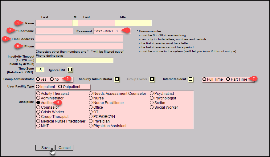 Security administrators can create an auditor login for their account. The following steps demonstrate how to do this. A Security Administrator can create the user and there is a minimal charge for a month. When no longer needed, the Security Administrator should disable the account. Please note: accounts set to the Auditor discipline will not have access to the full Chart Face. When accessing a patient chart the auditor will be directed to the Documents tab.