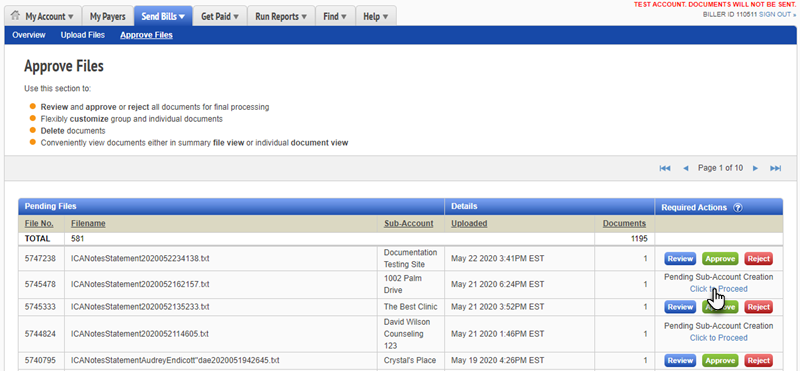 From the navigation menu, go to Send Bills, then click Approve Files.