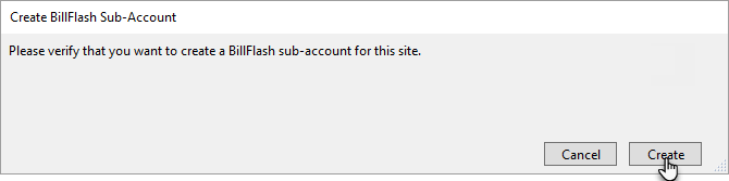 Click to Create BillFlash Sub-Account. (Note: this button will only appear when the site does not already have a sub-account) You'll receive a prompt asking you to verify you want to create a sub-account for the chosen site. Click Create to proceed or Cancel to return to Settings.