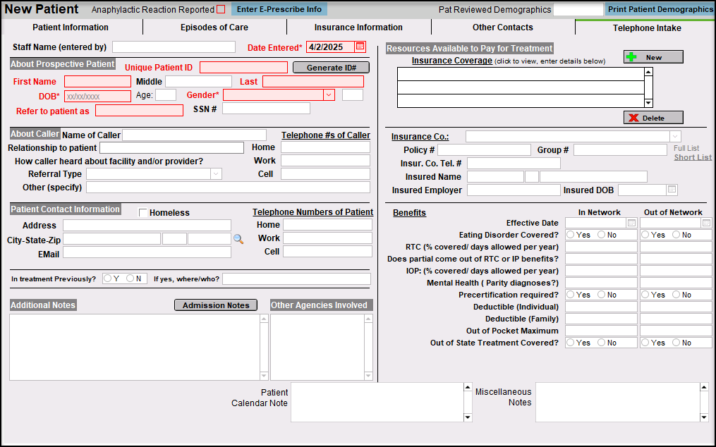Telephone Intake tab: This tab is used to document initial patient information.
