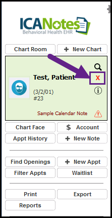 2. Make sure there is no patient selected. Having a patient selected will impact reminders for that patient. If there is a a patient listed, click the red X to remove the patient before moving on to step 3.