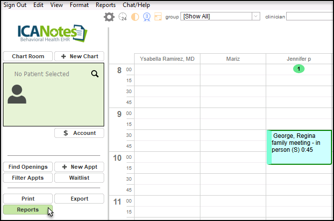 4. After the report runs, you can Print or Export. You are also able to filter by Clinician or Patient (or both) cancellation.