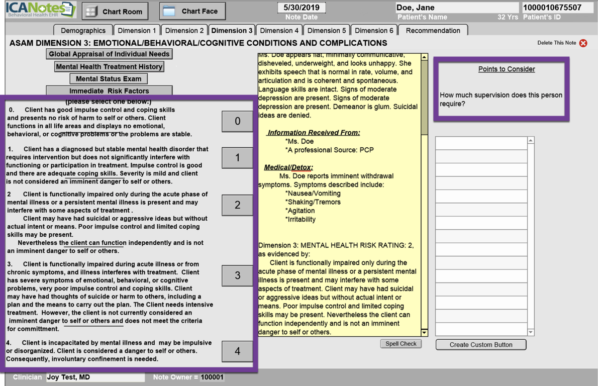 2. The Dimension 1 tab is for ASAM Dimension 1: Intoxication / Withdrawal window.