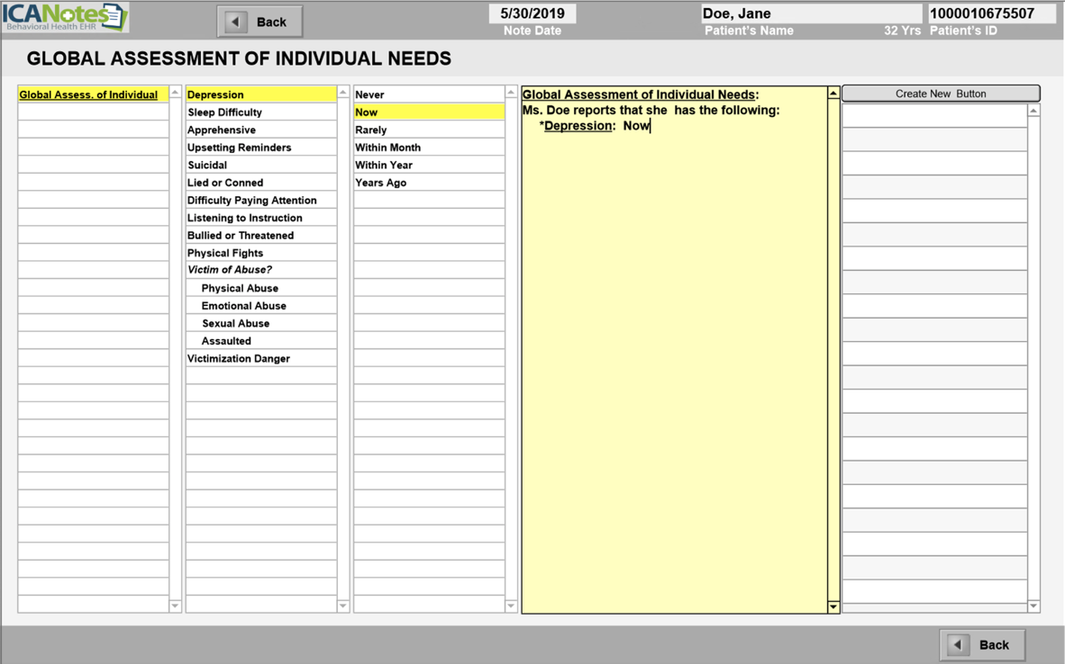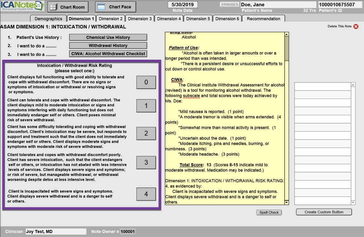 Intoxication / Withdrawal Risk Rating buttons give the description that you can pull into the report. In this example, 4 was chosen and the description of 4 was pulled into the yellow field (at the very bottom of the yellow field).