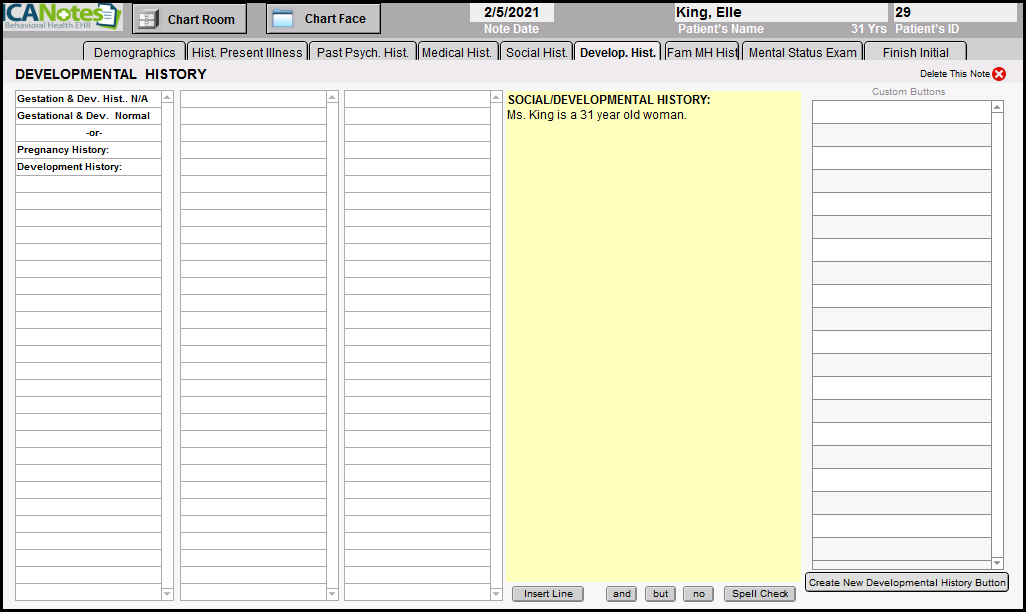 This tab replaces the Sexual History Tab that the Counselor discipline showed in the previous section. You can document your patient's gestational history (if known), pregnancy history (if relevant) and additional developmental content.