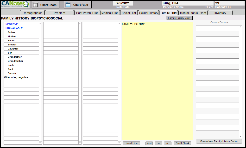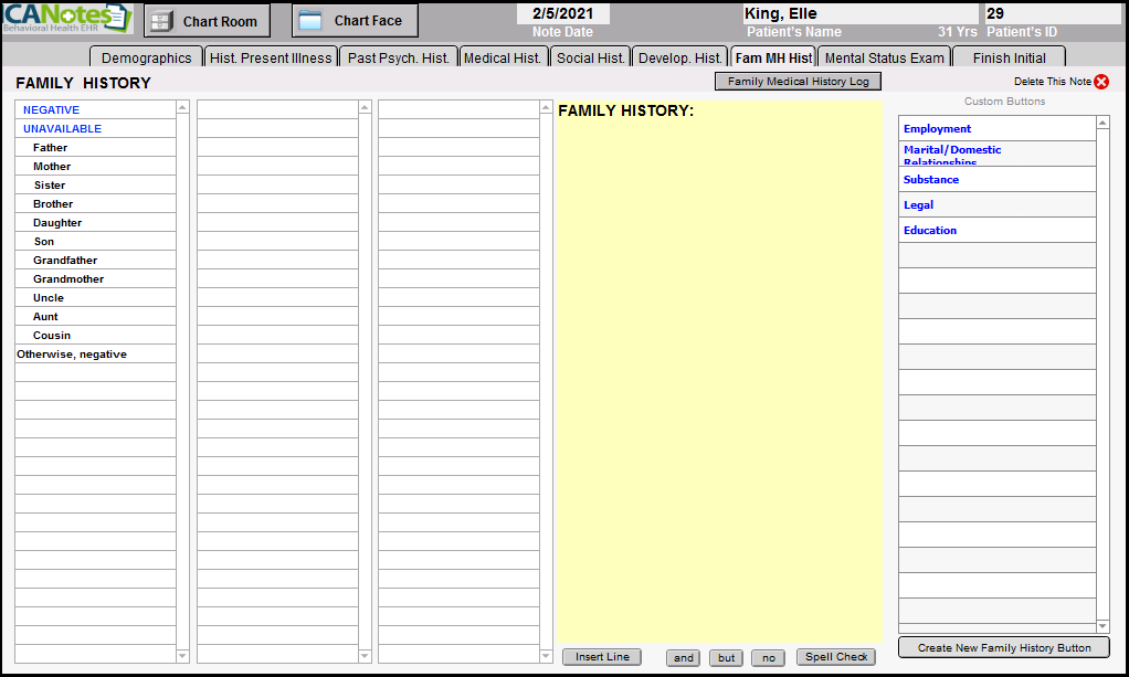 The Family MH Hist. Tab allows you to document any known family mental health status, treatment, diagnosis, etc..