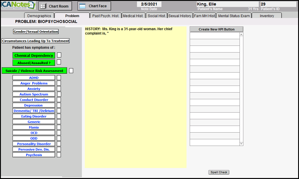 The Hist. Present Illness tab will not carry content forward from previous Assessments/Evaluations. This tab corresponds with the Problem Tab available to the Counselor discipline shown above.