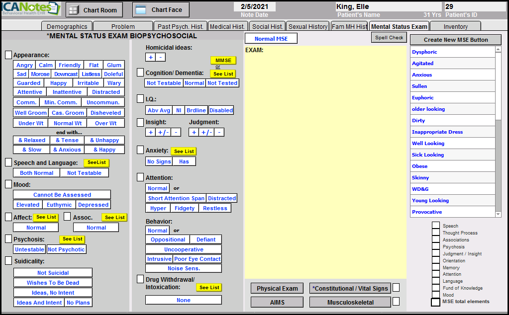 The account used for the images in this section had Counselor discipline. Select from the Shrubs along the right to add content, or customize your note content with Custom Buttons. Follow this workflow throughout all of the tabs in the Complete Evaluation.