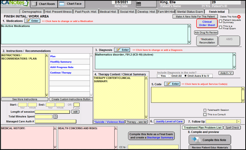 Finalize your Complete Evaluation on the Finish Initial tab. You can add or update a Diagnosis Code, Add Medications and Add a Service Code for billing, add medications, etc.. Be sure to click on 'Compile This Note' to save all of the content in a printable layout.