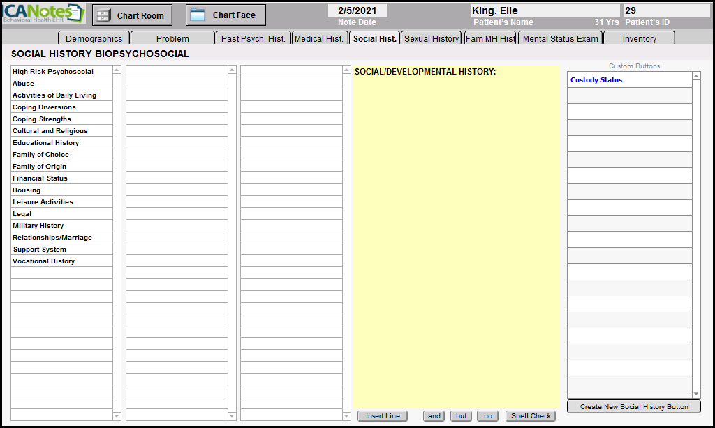 The Social Hist. Tab allows you to document on the patient's social, cultural and family factors that may influence them.