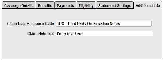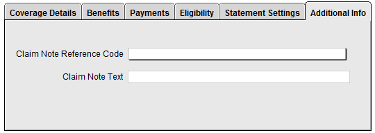 A new tab (Additional Info) has been added to the Insurance Information section of Demographics with options for Claim Note Reference Code and Claim Note Text. These fields are to be used for additional claim information contained in the Service Loop (2300 NTE Segment) on electronic claims (ANSI), and box 19 of the printed CMS 1500 form.