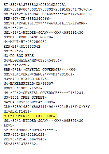 In the Billing/Productivity Report, after your claim has been prepped for submission, the Claim Note Text will be contained within the Service Loop 2300 NTE Segment (as highlighted below) for electronic claims.