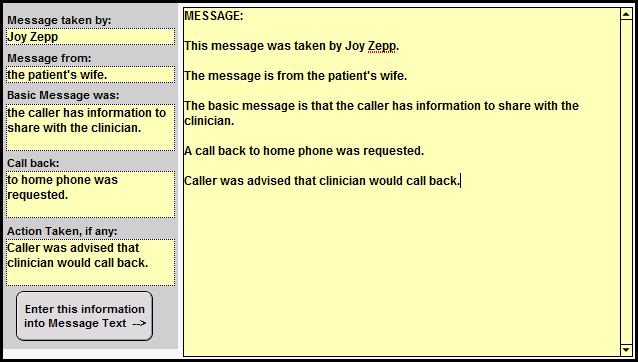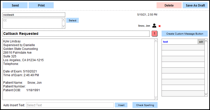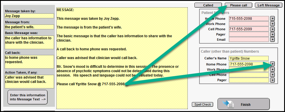 6. The contact number is easily able to be put into the message by using the button by the number. The Patient Numbers and Patient Contacts pulls from Demographics. The Caller field can be free texted in if desired.