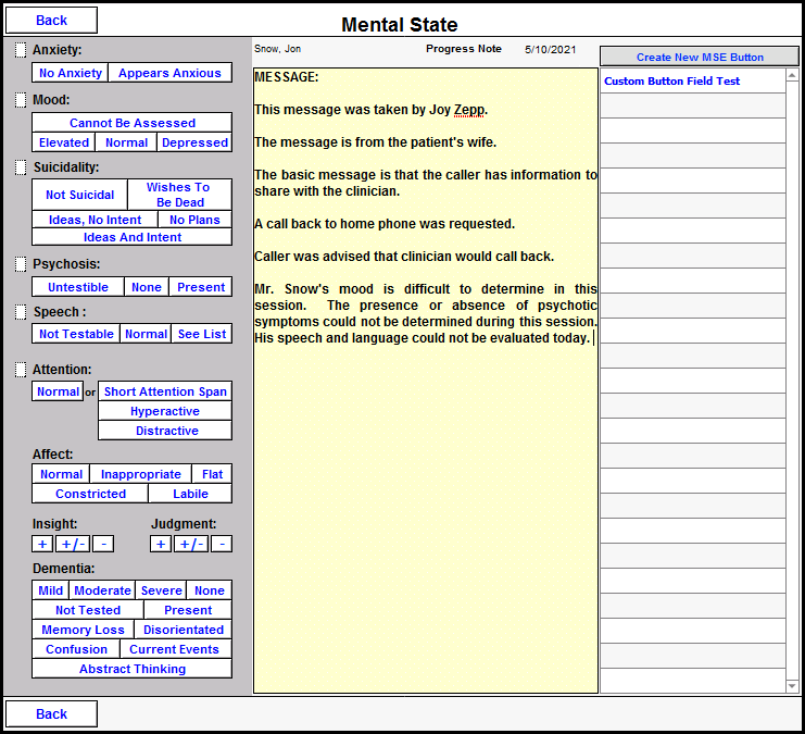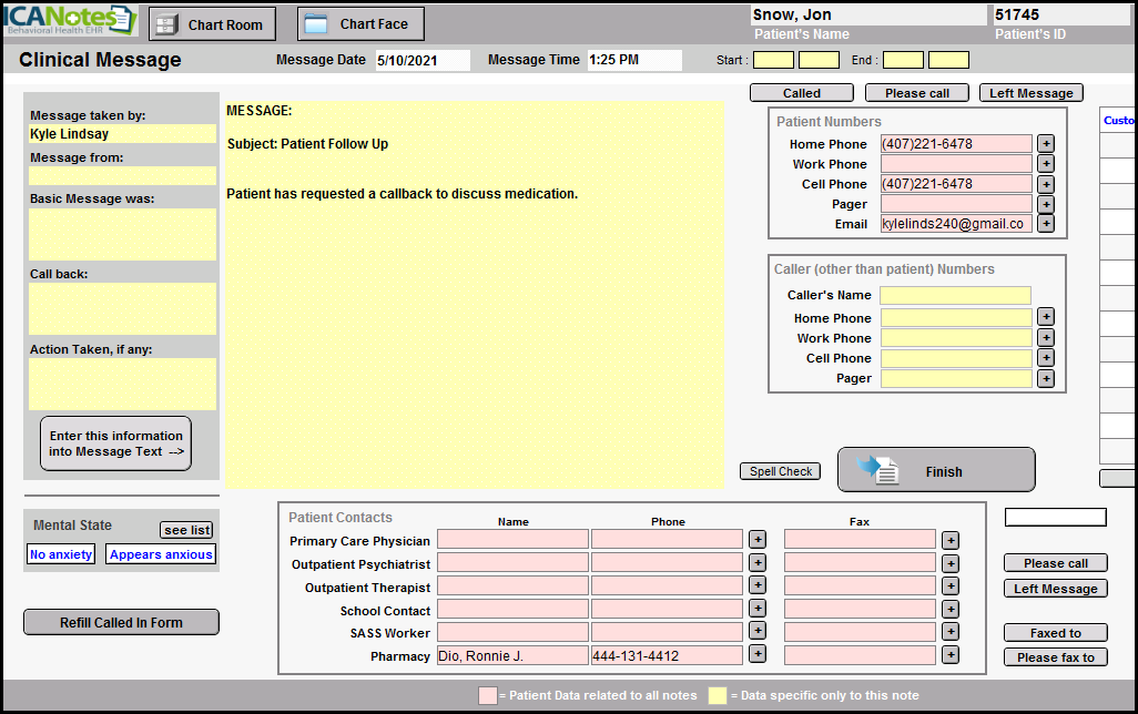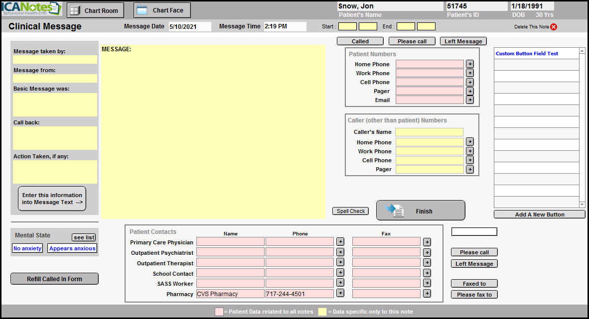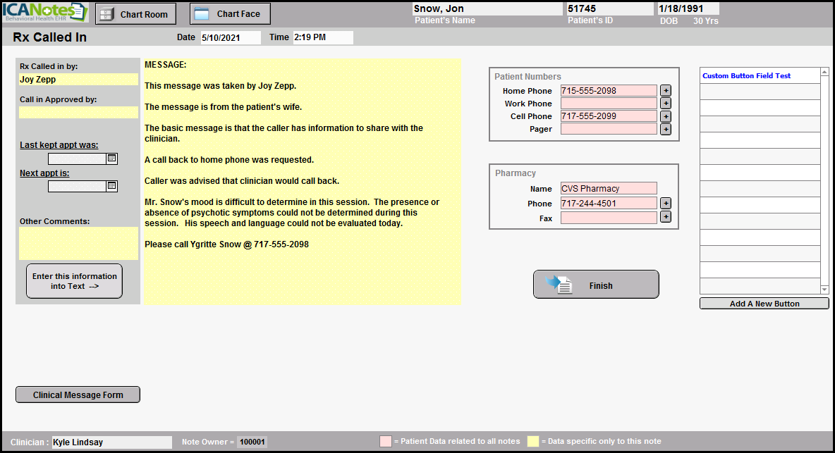 This can be filled out like the Clinical Message Form using the left column and Patient/Pharmacy numbers as desired. Once finished, you can click the button to finish the note or click the
