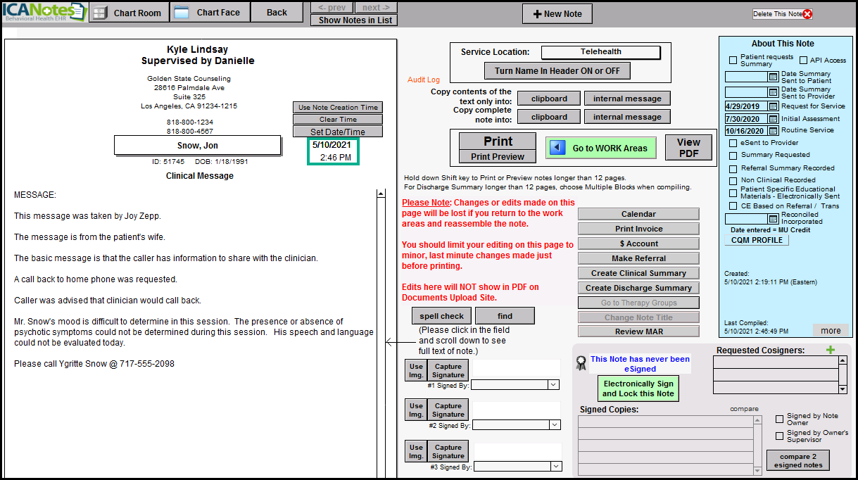 10. This will bring you to the Finished Note screen where the date and time will show. You also have the option to electronically sign if set up for this functionality.