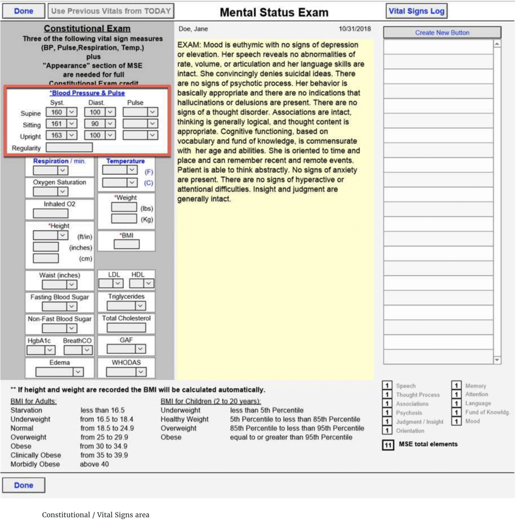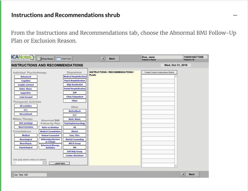 This is measured by the Constitutional / Vital Signs area and Instructions and Recommendations shrub.