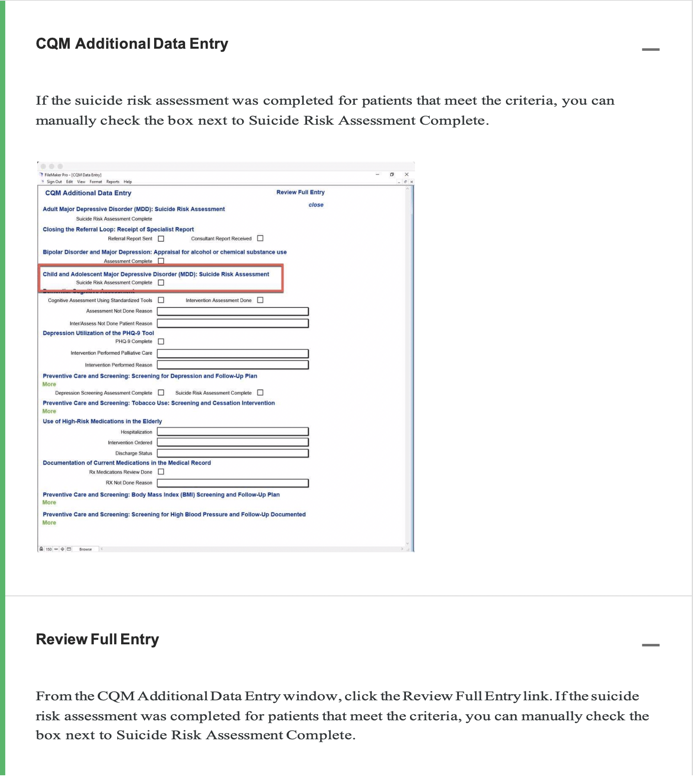 Measure Description: Percentage of patient visits for those patients aged 6 through 17 years with a diagnosis of major depressive disorder with an assessment for suicide risk
