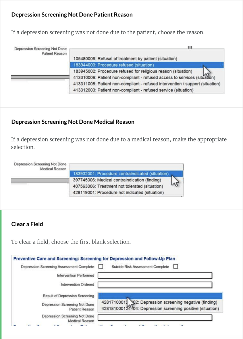 This is measured by the Depression shrub and Diagnosis popover window. From the Finished Note screen, click the CQM