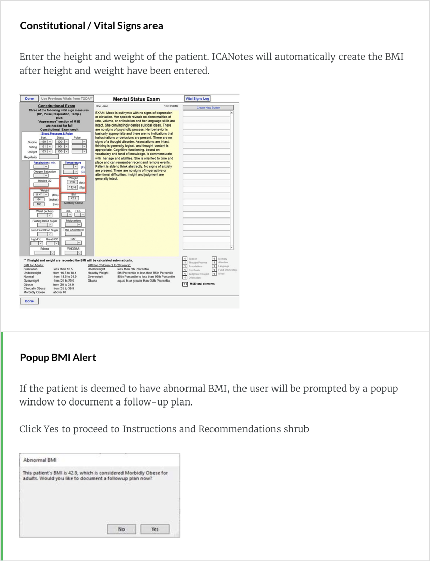- Numerator Statement: Patients with a documented BMI during the encounter or during the previous twelve months, AND when the BMI is outside of normal parameters, a follow-up plan is documented during the encounter or during the previous twelve months of the current encounter