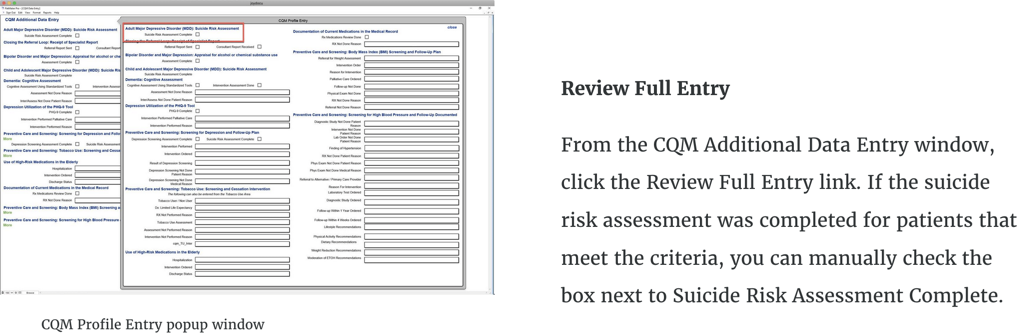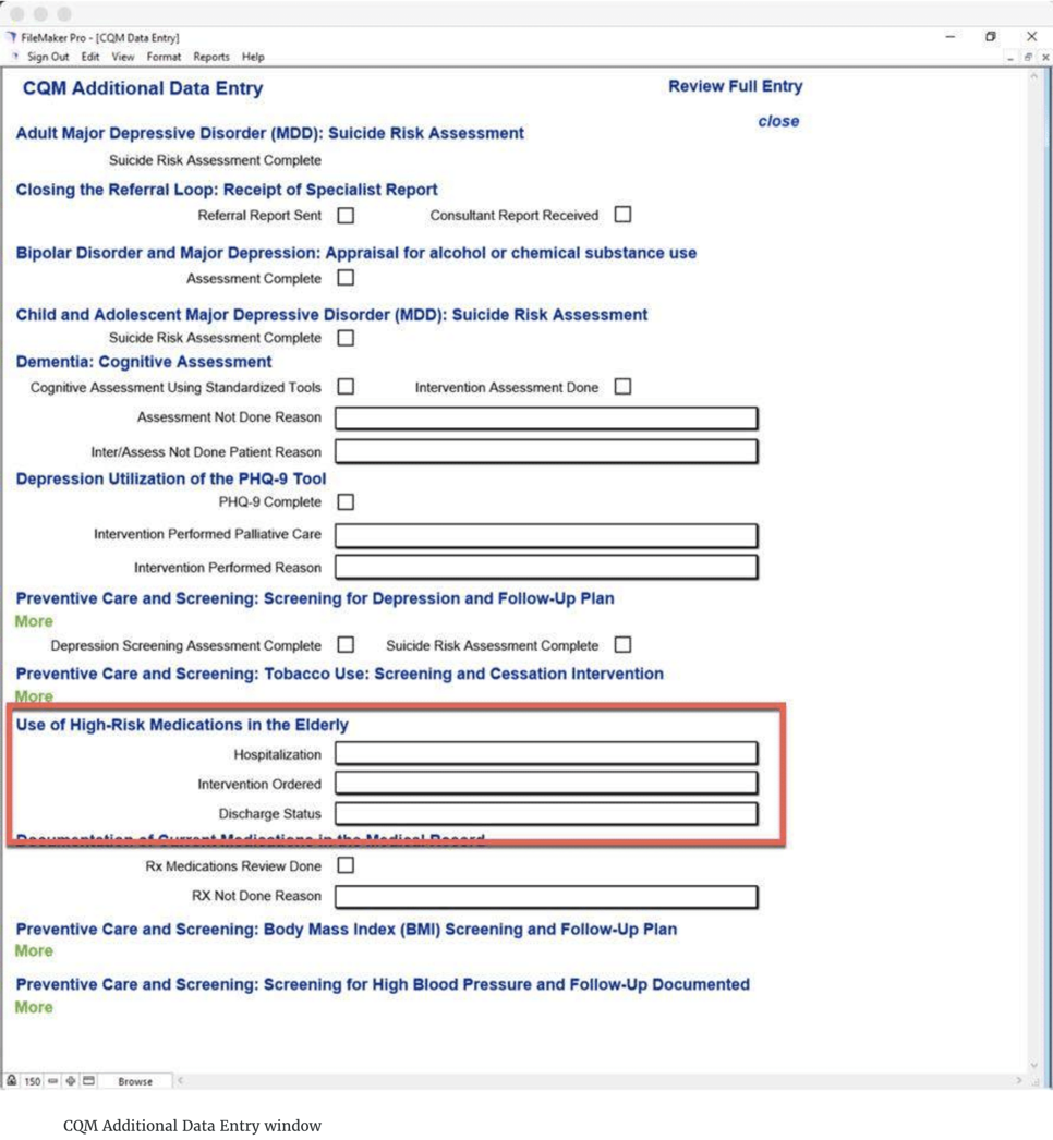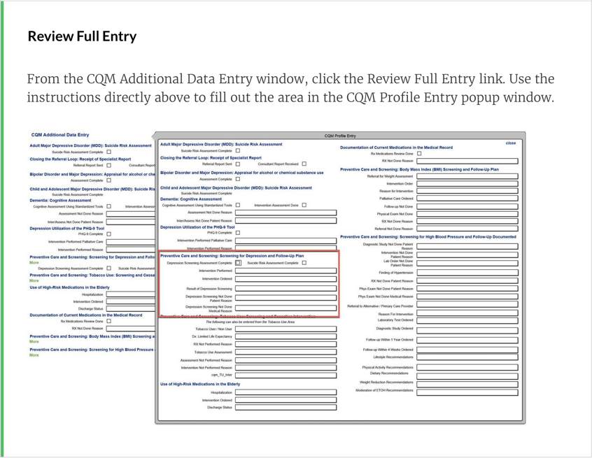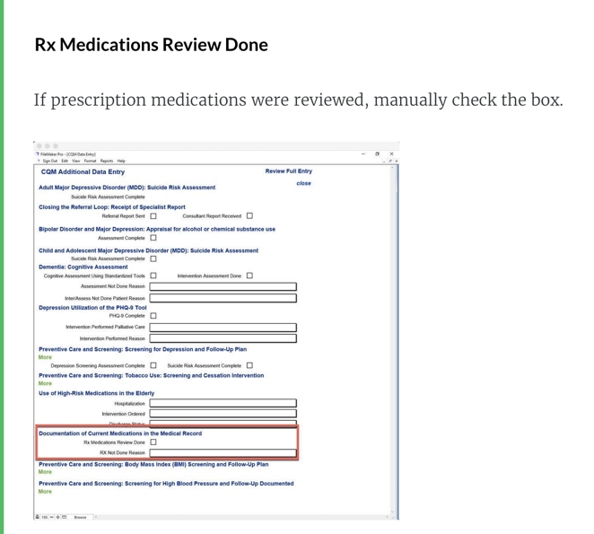 On the CQM Additional Data Entry window, you are able to choose the prescription medication review was done or the reason why the medication review was not done.
