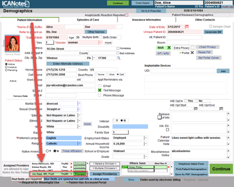 Check to make sure the clinician who is reporting on MIPS is the Principal clinician in a patient's chart face in Demographics to get credit for the Quality measure. See below.