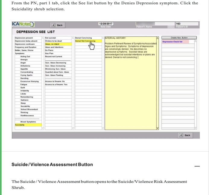 This is measured by the Depression Shrub and Suicide / Violence Assessment button on notes.