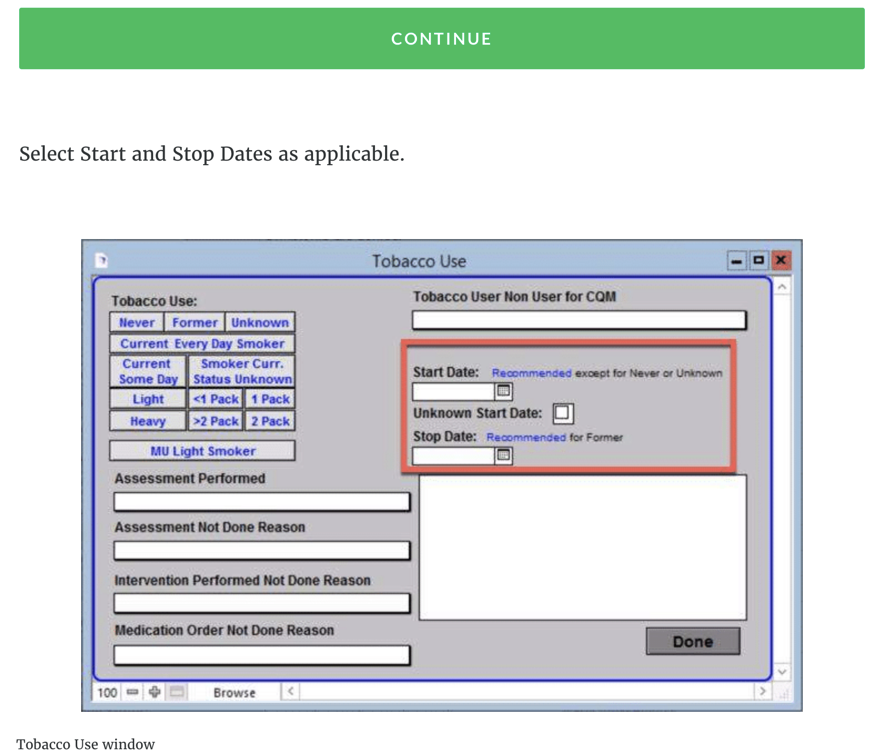 - Population 3: Documentation of medical reason(s) for not screening for tobacco use OR for not providing tobacco cessation intervention for patients identified as tobacco users (eg, limited life expectancy, other medical reason)
