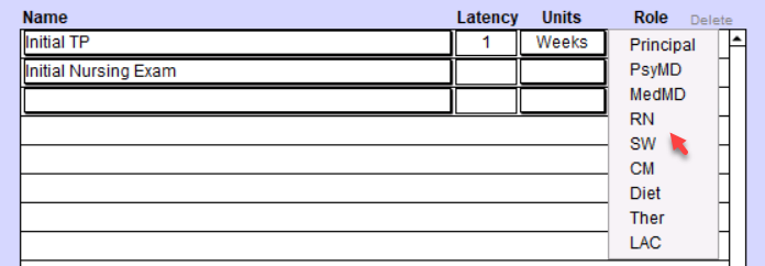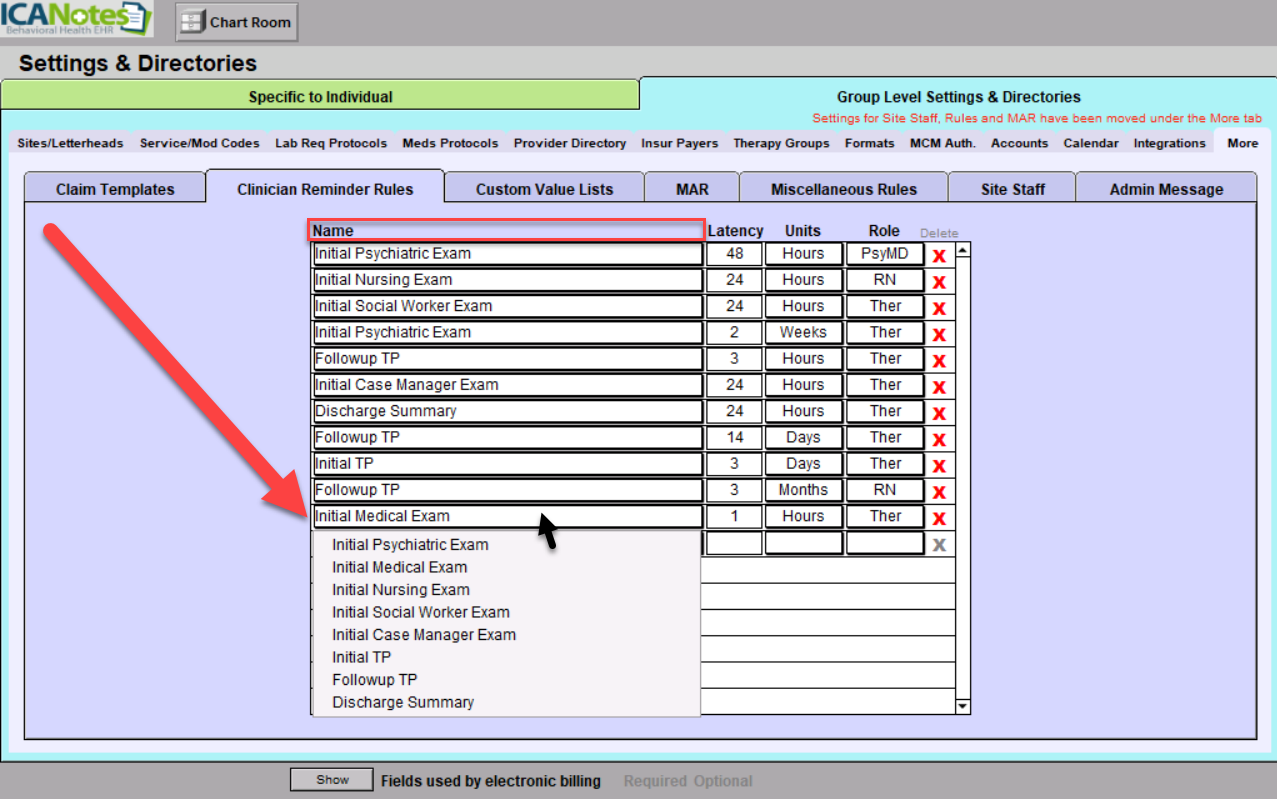 Start building a rule by first clicking into the Name dropdown and making a selection. Your choices include initial exams of various types (psychiatric, medical, nursing, etc), treatment plans, and discharge summary.