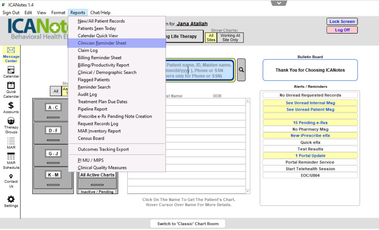 Access the Clinician Reminder Sheet from the Reports dropdown menu located at the top left corner of your ICANotes session.