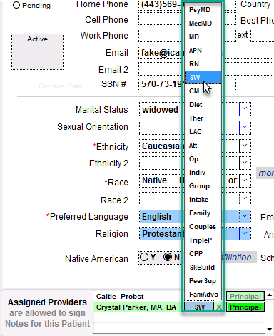 Ensure that the patient's Assigned Providers are designated with the appropriate Role from the chart face. To do this, navigate to the patient's chart, then click into Demographics. In the Assigned Providers section at the lower left corner, click into the Role field.