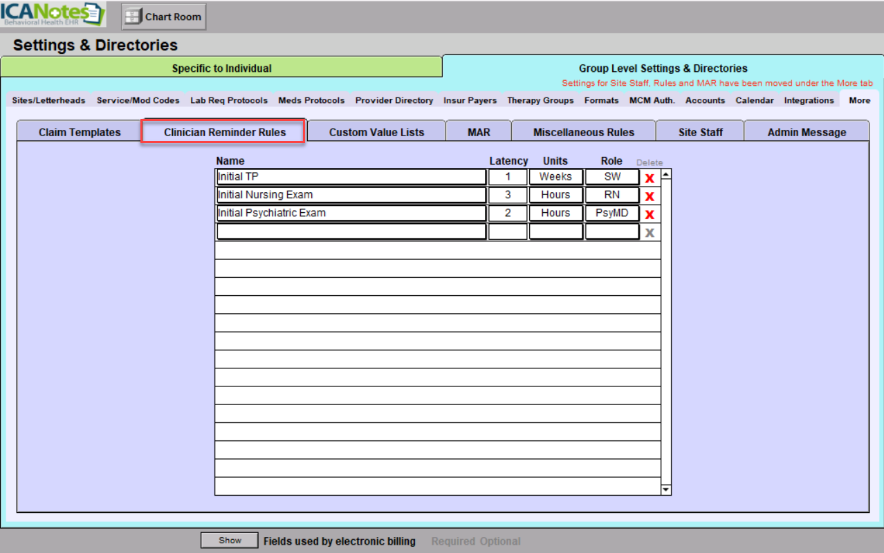 ICANotes group administrators have access to Clinical Reminder Rules. When these rules are established, the Group Admin view of the Clinician Reminder Sheet will include reminders to complete certain types of clinical documentation for the patient based on their admission date.