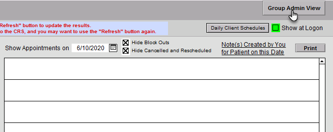 The box located in the top left quadrant of the Group Admin View contains your notices for Clinical Reminder Rules that are due, with the Clinician's name in the first column, followed by patient name, the specified clinical reminder, due date, and extra buttons for deleting or quickly accessing Patient Accounts and the patient's chart: