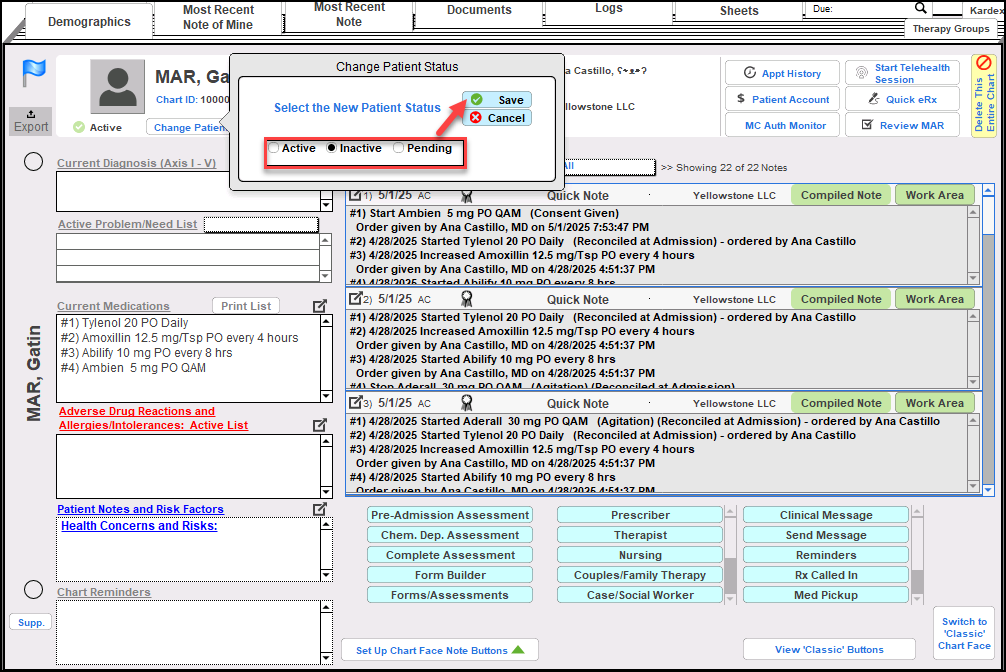1. When you discharge a patient, you may select to inactivate the Chart from the button. Start off by changing the patient's status to 'Inactive' in the upper-left corner of the Chart Face.