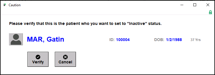 2. A window will appear with the patient's name, ID, DOB, and age. Click 'Verify' to acknowledge that you want to change the patient's status.