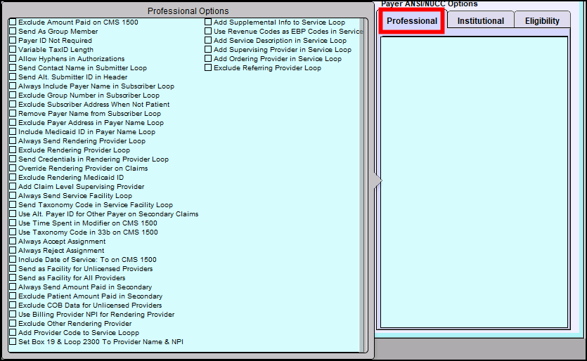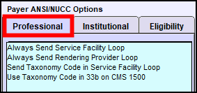 For additional billing options, including rules that modify how your electronic or paper claim is prepared, go to the Professional tab on the right side of the Payer and click on the blue area: