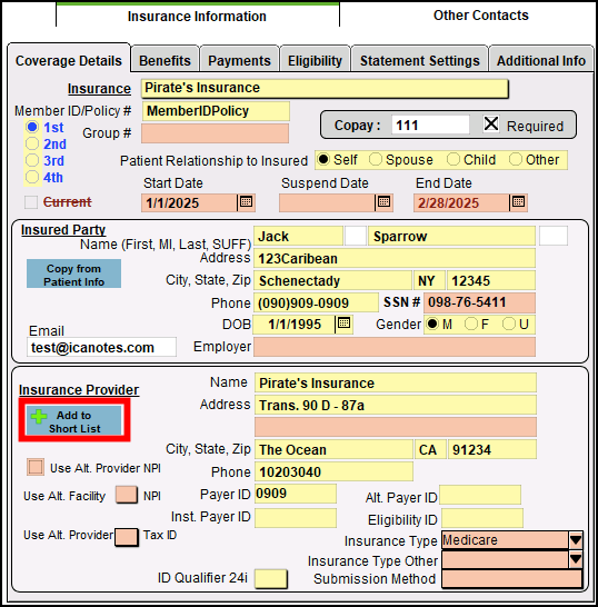 Additionally, a user may add an Insurance Payer to the Short List via Demographics by manually entering in the Payer’s information, then clicking