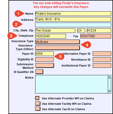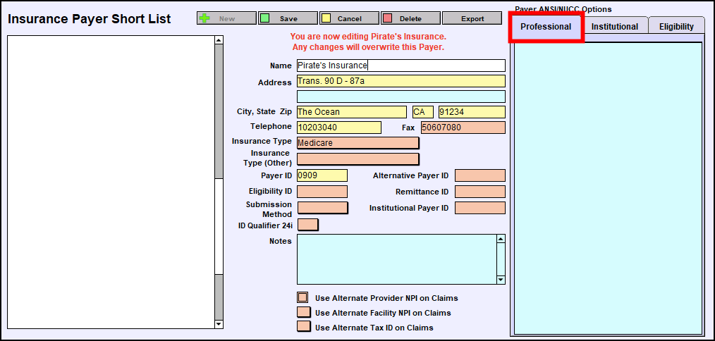 The text fields in the middle of the screen will now be editable for you to enter the Insurance Payer information. This is typically found on the patient’s insurance card. If you are uncertain about a specific Payer’s address or insurance type, check with your Clearinghouse or the Payer.