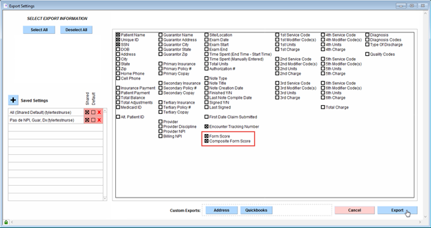Search functionality within the New Style Billing/Productivity Report now includes the ability to specify custom forms as a search criterion. When ‘Custom Form’ is selected from Note Search Options, an additional dropdown box will appear, allowing for a specific form to be selected. Additionally, new export options have been added for forms that track scores to export Form Score and Composite Form Score. This Knowledge Base article will guide through the workflow of searching for a custom form in the Billing/Productivity report, exporting with the new options, and a list of qualifying score-tracking forms.