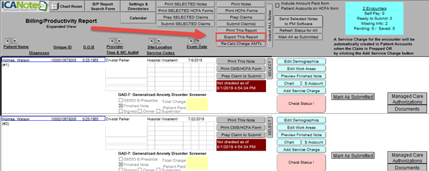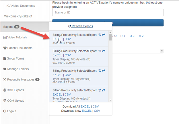 Once exported, login to the ICANotes Documents/Upload site (https://upload.icanotes.com) with your ICANotes username and password. From the navigation menu on the left, click to view recently exported reports, then download the exported report (Excel or CSV).