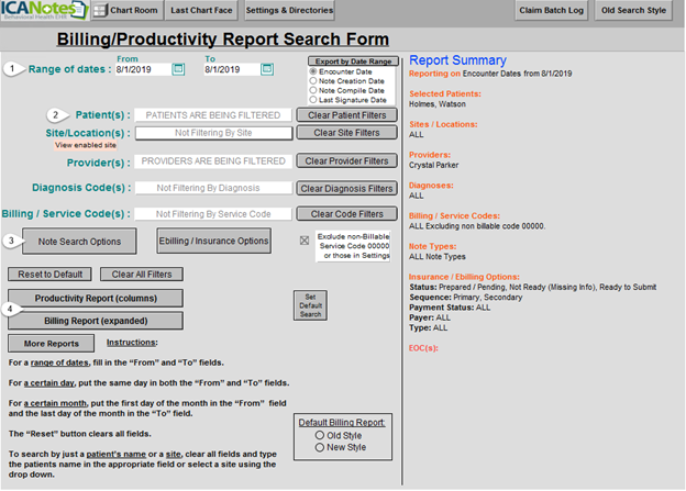 Set a range of dates for your search (1), filter by patients as needed (2), and in Note Search Options select Custom Form. In the Note Title dropdown box, select the name of the form to search for, or use free-text (example: PHQ to find PHQ-9 and PHQ-A forms). When all appropriate search criteria is set, run the report as a Productivity or Billing Report (4).