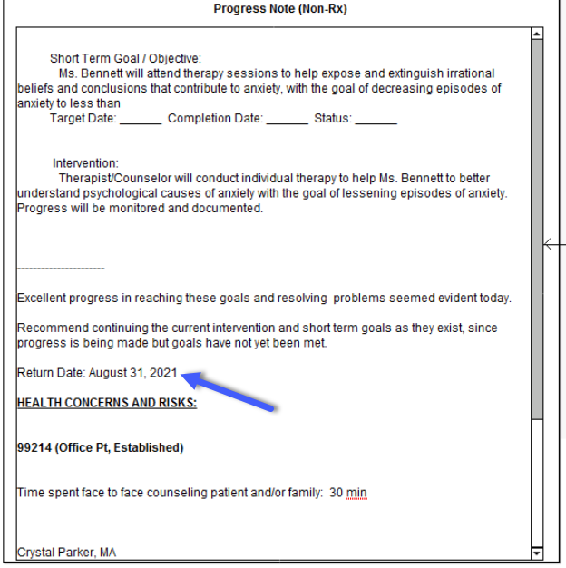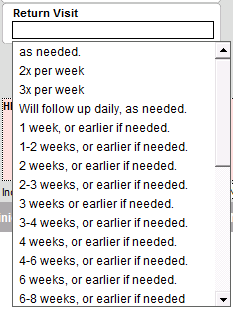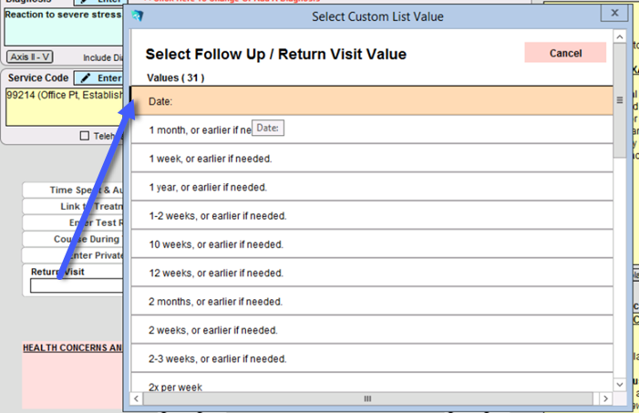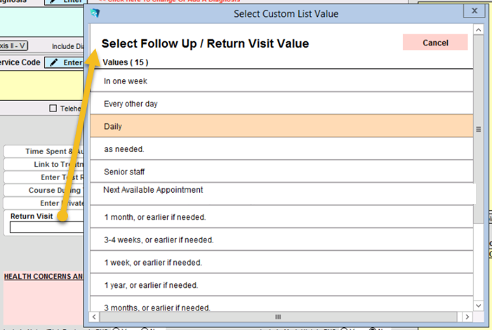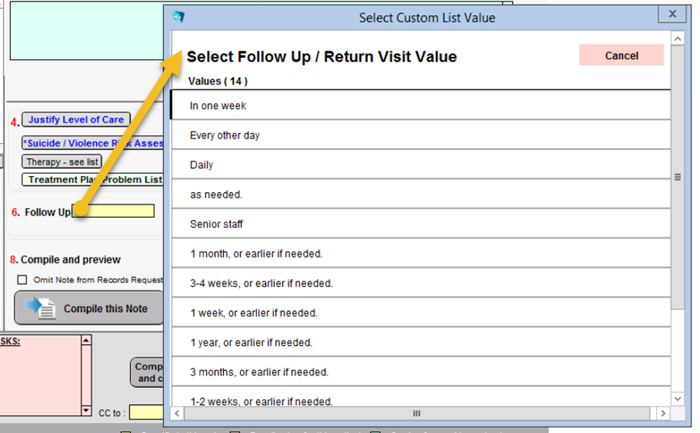 When clicking into the Return Visit field in a progress note, the Select Custom List Value pop up will appear, allowing the user to make a selection that will populate in the field.